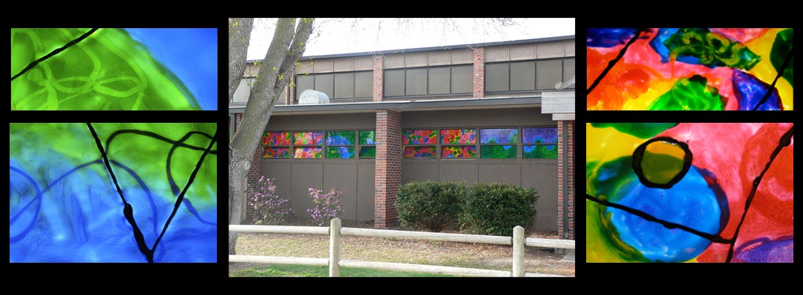 Partially funded by a Nebraska Arts Council grant, the goal of this project was to create a colorful and inviting painted glass mural that stretched across the entire front of this charming public school. Designing the windows was the responsibility of the 5th and 6th graders, but every Oakdale student painted on at least one of the windows. Over three hundred students participated in this project.